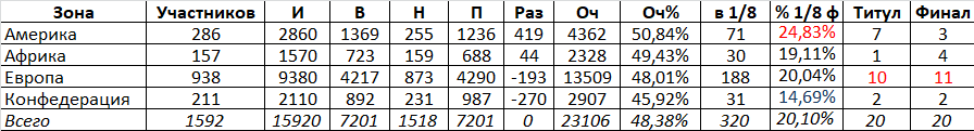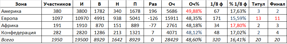 Имея наибольшее количество стартовавших клубов в турнире, не удивительно, что европейцы завоевали наибольшее количество титулов (13) и еще 11 клубов имеют статус финалиста Клубного Кубка. У зоны Америка в наличии три титула и еще два финалиста. Дважды победителями становились африканцы и клубы из Конфедерации, только у первых – три финалиста, у вторых – четыре.