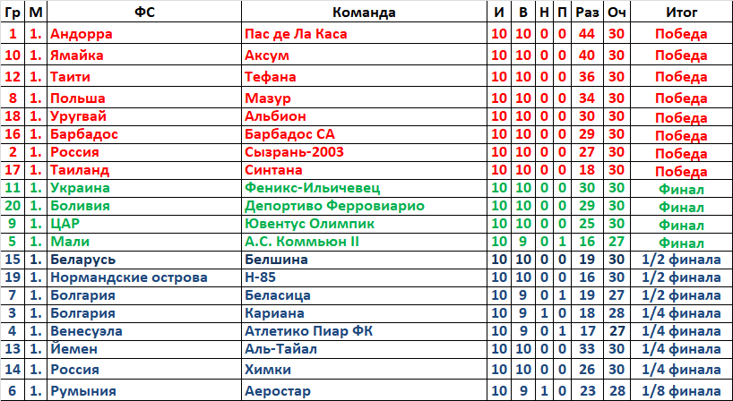 Клубы «Пас де Ла Каса» (Андорра) и «Аксум» (Ямайка) практически катком прошлись по своим соперникам, победив во всех встречах и с шикарной разницей забитых и пропущенных мячей, 44 и 40 соответственно. Не свернули с этого пути и в плей-офф, уничтожая своих соперников.