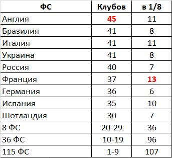 ФС Италии и Англии входят в топ-3, по количеству заявленных клубов и вышедших в плей-офф (41 и 11, 45 и 11 соответственно). У итальянцев лучший процент набранных очков (55,37%), чем у англичан (51,70%). Французы же имеют наибольшее представительство клубов в плей-офф – 13. При этом и заявлено меньшее количество клубов в турнире (37) и процент набранных очков лучше, чем у англичан (52,52%).