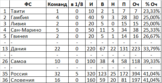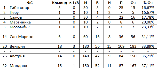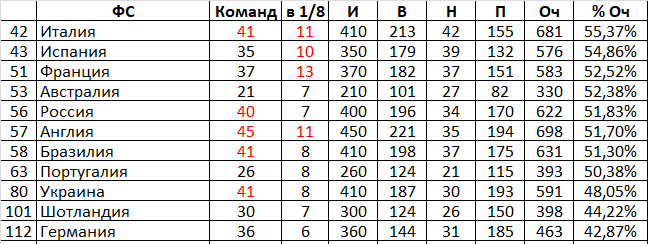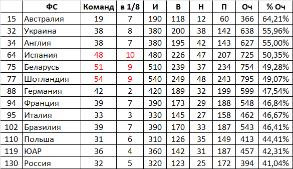 У ФС Испании, Беларусь и Шотландии, которые имеют самые высокие выше озвученные показатели, но процент набранных очков колеблется около 50% (50,35%, 49,28% и 49,07% соответственно).