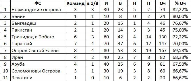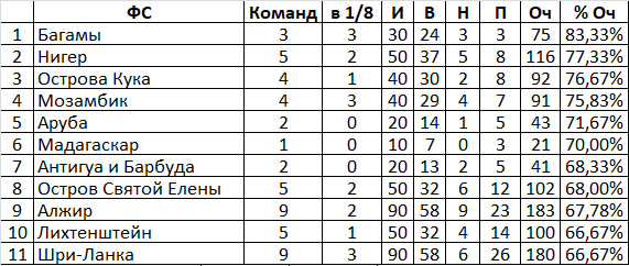 Только один представитель ФС Острова Кука сумел преодолеть групповой турнир, но и вылетевшие команды этого союза выступили достойно. По этой причине островитяне занимаю третью строчку по проценту набранных очков – 76,67%. О ФС Мозамбик уже ранее говорили, его три из четырех вышедших в плей-офф клуба, набрали более 75% возможных очков (91 из 120). Далее следуют ФС Аруба, Мадагаскар и Антигуа и Барбуда, имеющие также хороший процент набранных очков. Увы, ни один их представитель не попал в число 16 лучших в своих группах, и на троих всего 5 стартовавших клубов в турнире. Так же 2/3 и более возможных очков набрали команды ФС Острова Святой Елены, Алжира, Лихтенштейна и Шри-Ланки.