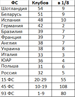 ФС Украина вместе с ФС Англии идут в авангарде с показателями выше среднего (55,96% и 55,00%) процента набранных очков, при 38 стартовавших клубов, 8 и 7 соответственно прошедших в плей-офф. Отдельно стоит выделить австралийцев, чьи клубы сумели тоже хорошо выступить. Показатель в 64,21% – хороший результат, и это с учетом того, что стартовавших клубов было всего 19, и 7 из них продолжили бороться за трофей. Можно ли назвать ФС Австралии лучшим союзом на групповом этапе Клубного Кубка или таков ФС Испании, с его 10-ю представителями в плей-офф турнира Клубного Кубка?