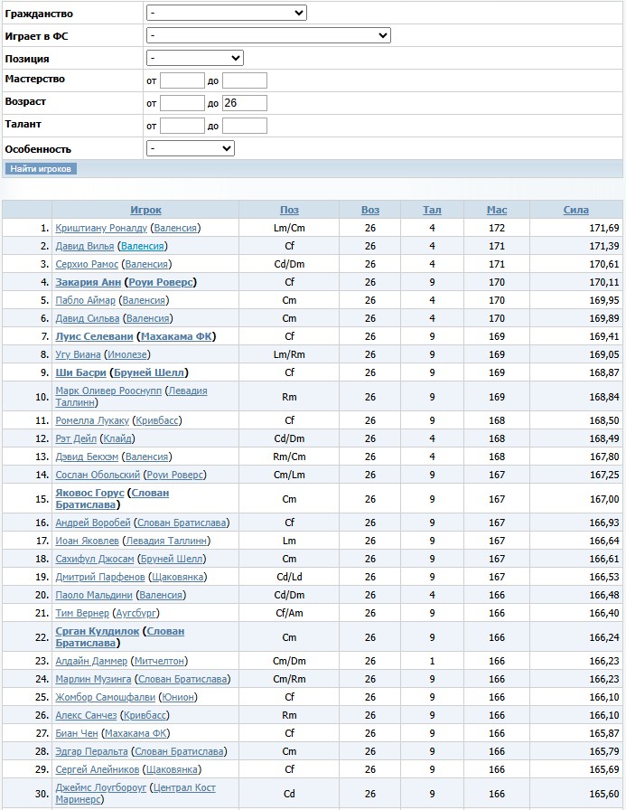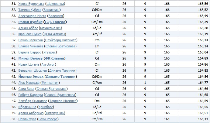 И наши аналитики обратили внимание на то, что в ТОП-50 игроков в возрасте не старше 26 лет входят по 8 игроков из двух клубов – испанской «Валенсии» (170,6) и словацкого «Слован Братислава» (165,1).