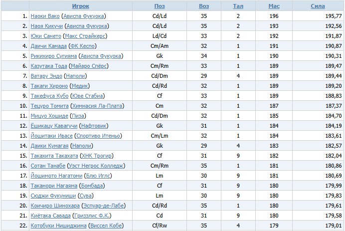 Если же оценивать игроков из Японии в возрасте до 30 лет включительно, то помимо двух сильных четверок из «Наполи» (м. 189 и 183, возраст 29 лет), и 30-летнего единички вратаря с мастерством 176, остальные игроки, которые находятся на подходе к сборной, это обычные девятки с мастерством 173-181, из которых нет даже ни одного долгожителя.