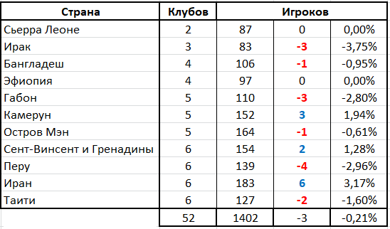 В целом у «малочисленных» стран за рассматриваемый период просматривается уменьшение игроков (-3 и -0,21%). Настолько же процентов (0,19%) у «многочисленных» наций наблюдается прирост, но это уже не те 3 футболиста, а целых 48!