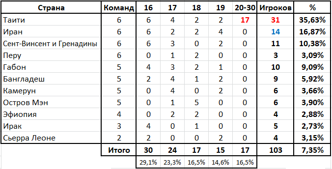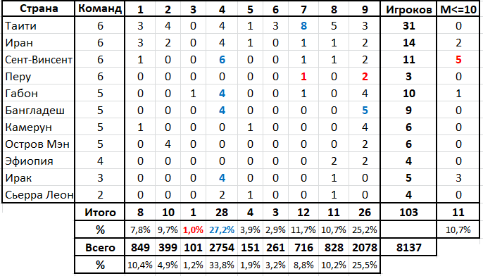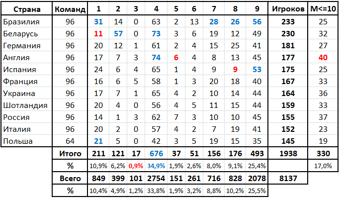А что же происходит в «многочисленных» странах, как у них распределились появившиеся игроки по талантам?