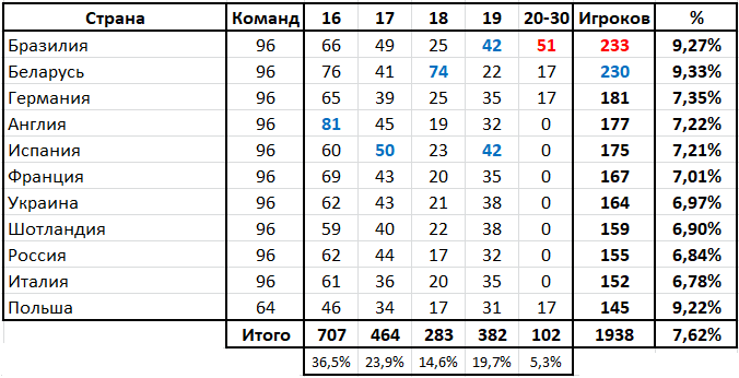 Небольшое пояснение: 407 игроков – это футболисты регенерированных команд, естественно, они не из ДЮСШ. Так же и некоторое количество 16-19-летних из 7730 будут регенерированными. К слову, при анализе новых игроков (с новым ID) в разрезе по странам было выявлено порядка 24 регенерированных команд, на которых приходится по 17 футболистов возрастной группы 20-30 лет. В регенерированной команде 22 игрока, и 5 из них в возрастной группе 16-19 лет. Общее количество получается порядка 120 молодежи.