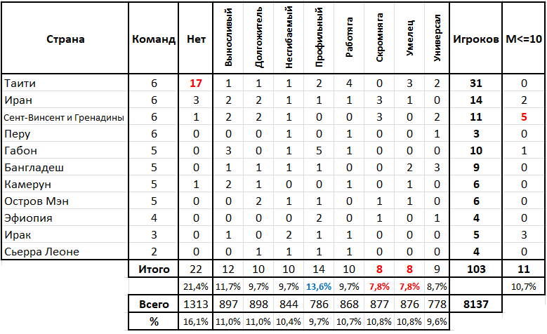 У «малочисленных» наций не совсем большое количество «выпускников» (103), при этом пятая часть их приходится на регенерированную команду из Таити, в которой большинство футболистов не имеют Особенность. Примечательно, у Габона каждый второй игрок получил в свою карточку параметр «Профильный», а больше всего «Работяга» как раз у представителей Таити.