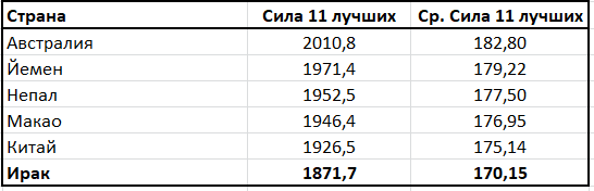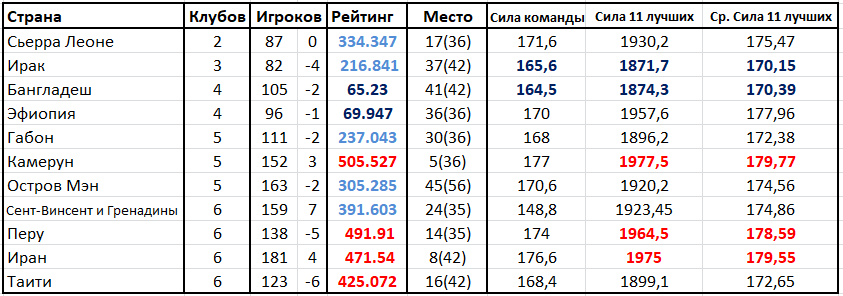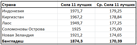 Одной из причин низкого рейтинга является небольшая сила «11 лучших» у этих сборных команд. Бангладеш среди 105 своих футболистов смог найти мастеров с уровнем силы «11 лучших» игроков 170,39 балла. Это не самый низкий показатель среди «малочисленных» наций. Наименьшее значение средней силы «11 лучших» у сборной Ирака (170,15) при скромном рейтинге 216,841, или 37 месте в Конфедерации.