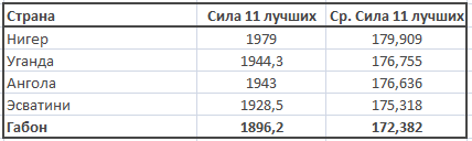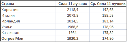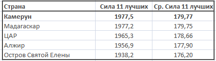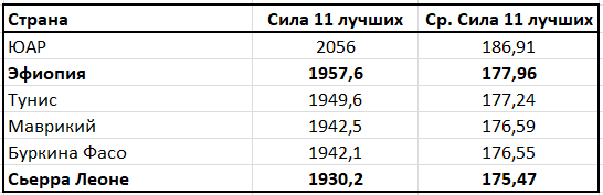 Эфиопы, имея достаточно низкий рейтинг, обладают достаточно высоким значением средней силы «11 лучших» (177,96). У сборной Сьерра-Леоне эти показатели противоположны: по рейтингу 334,347 баллов (17 из 36 мест), а вот мастерство – всего 175,47.