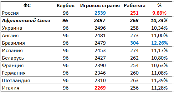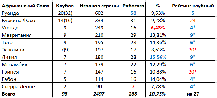 Если посмотреть сам состав Африканского Союза, то, как уже ранее говорилось, в этом объединении по количеству клубов и игроков лидируют Руанда и Буркина-Фасо: 20 и 14 команд, 602 и 334 футболиста. Двенадцать руандских клубов было расформировано, что всё равно не уменьшило представительство в новом союзе, поэтому не удивительно, что наибольшее количество игроков с особенностью «Работяга» у них (58) с процентным соотношением 9,63%.
