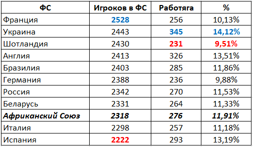 В последние сезоны вырос спрос на игроков с особенностью «Работяга». Наибольшее количество футболистов с этой особенностью играют в ФС Украины (345), на английской земле таких игроков 326. Новообразованный союз африканских стран имеет в своем распоряжении 276 игроков «Работяга». В процентном выражении у ФС Украины наивысший показатель 14,12%, в то время как в шотландских клубах всего 231 обладатель особенности «Работяга», или 9,51% от общего количества. Средний показатель по Лиге составляет около 11-11,5%, он практически такой же, как у Африканского Союза (11,91%).