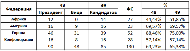 Увы, как видно из приведенной таблицы, общее количество кандидатов уменьшилось, по отношению к количеству ранее занимавших пост президентов ФС. Всего 85 менеджеров озвучили свое желание на форуме с целью в будущем сезоне занять пост президентов соответствующих союзов. Больше всего удивляет не увеличение количества потенциальных президентов в зоне Африки с 12 до 14, а резкое уменьшение их в самой Европе. Падение с 46 до 39 (при 52 ФС) – согласитесь, серьезное. Без президентов могут остаться Албания и Босния, Андорра, Армения, Италия, Люксембург, Польша, Фареры. И это к тем шести странам (союзам), у которых не было президентов в 48-м сезоне. В перспективе всего 75% в европейских странах будет свой футбольный «начальник».